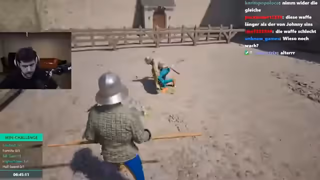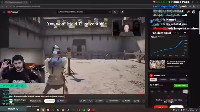 14:23:21Nach den vergeblichen Versuchen, das Half-Sword-Spiel zu meistern, beginnt der Streamer, seinen Chat mit einer strategischen Anleitung zu versorgen. Er gibt prägnante Tipps zur Verteidigung, zum Waffeneinsatz und zur Taktik im Kampf. Er erklärt die Bedeutung der passiven Abwehr, der richtigen Haltung und des gezielten Angriffs auf Schwachstellen in der Rüstung des Gegners. Der Ton ist dabei deutlich lehrreicher und weniger emotional.