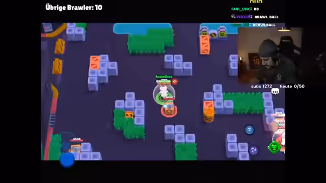 00:40:29Der Streamer konzentriert sich nun voll auf sein Vorhaben, die 1000 Trophäen-Marke in Brawl Stars alleine zu erreichen. Nachdem er die Spielmodi und Belohnungssysteme erläutert hat, beginnt er mit dem Spiel im Modus Solo-Showdown. Er durchlebt einige Runden, dabei sammelt er Trophäen auch bei Niederlagen und öffnet verschiedene Drops, um Belohnungen wie Skins zu erhalten. In einem Spiel kämpft er gegen zwei Zuschauer, von denen einer als Troller agiert und das Team zum Verlust führt, was beim Streamer Frustration auslöst.