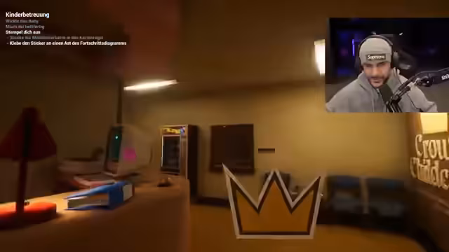 03:30:52Der Streamer beginnt seine Arbeit in der 'Krone Kinderbetreuung' und muss sich um das Baby kümmern, das er bereits aus den vorherigen Kapiteln kennt. Er soll es füttern, mit ihm spielen und es bei Laune halten, während seine Leistung überwacht wird. Er versucht, das Baby auf ein Trampolin zu werfen, um es so weit wie möglich zu schleudern, und kommentiert die Situation mit 'Kobe', in Anspielung auf den Basketballspieler. Er muss eine Flasche für das Baby finden, die sich in einer 'stillen Ecke' im Spielzeugparadies befindet. Der Streamer bemerkt ironisch, dass das Spiel eine perfekte Kondomwerbung sei, da es einem die Lust auf Kinder nehme. Er muss das Baby in eine Prüfstation legen und eine Sequenz korrekt eingeben. Nachdem er das Baby ins Bett gebracht hat, versucht er, es mit Trickshots in einen Korb zu werfen, wobei er 'LeBron James' ruft. Er beschließt, das Spiel zu beenden, da er 'Überstunden' bekommen hat, weil er nur Basketball gespielt hat. Er muss seine Mitarbeiterkarte ins Kartenregal stecken und einen Sticker auf einen Ast kleben, was er als unfair empfindet, da er keine Freizeit hatte. Plötzlich bemerkt er, dass das Baby verschwunden ist und findet es in der 'stillen Ecke', wo es anscheinend in die Hose gemacht hat. Er versucht, dem Baby 'Lektionen' zu erteilen, indem er es herumwirft und es dazu bringt, zu lernen, nicht mehr in die Hose zu machen. Schließlich legt er es auf ein Blumenkissen und soll ihm eine Geschichte erzählen, was er widerwillig tut.