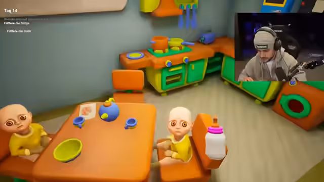 03:59:55Der Streamer erkundet einen neuen Bereich, in dem er auf verschlossene Türen und geheimnisvolle Nachrichten stößt. Er versucht, Babys in einen gesperrten Raum zu bringen und entdeckt eine Zeichnung, die er selbst angefertigt hat. Die Ankunft eines weiteren Babys wird von einer Intro-Musik begleitet, was den Streamer frustriert, da er das vorherige Baby noch nicht abgegeben hat. Er muss sich um zwei Babys gleichzeitig kümmern, die Flaschen benötigen und sich an verschiedenen Orten im Kindergarten aufhalten. Die Babys erhalten eine Dönerbox als Essen, die der Streamer selbst probiert, was zu weiteren humorvollen Interaktionen und der Entdeckung führt, dass er Babynahrung nicht essen darf. Die Suche nach den Babys führt ihn durch verschiedene Räume, in denen er auf weitere Rätsel und Hinweise stöße, die ihn tiefer in die Geschichte des Spiels eintauchen lassen.