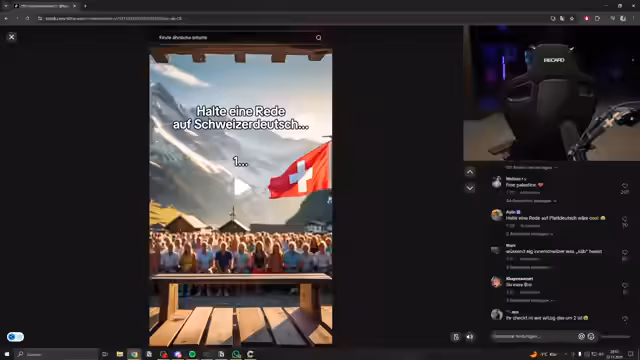 04:55:50Der Streamer leitet zu einer Reaction-Session über, in der er verschiedene virale Videos kommentiert. Er reagiert auf einen "Clipfarm"-Burger, der zu groß ist, um gegessen zu werden, und auf ein Video, in dem ein Mann in einer Badewanne ertränkt wird. Er kommentiert humorvoll die Absurdität der Situationen und die Reaktionen der Protagonisten. Anschließend schaut er sich Videos über Schweizer Kultur an, darunter eine Rede auf Schweizerdeutsch und Bilder von Luzern, der Stadt, in die er ziehen möchte. Er äußert seine Begeisterung für die Schönheit der Schweiz und die Möglichkeit, dort zu leben. Er diskutiert über die Schweizer Fußballliga und die Qualität der Jugendmannschaften und äußert den Wunsch, seinen Hund Miles mitzunehmen, obwohl dies aufgrund familiärer Bindungen schwierig ist. Die Session endet mit der Ankündigung eines Raids und des nächsten Streams.