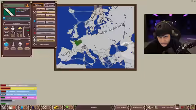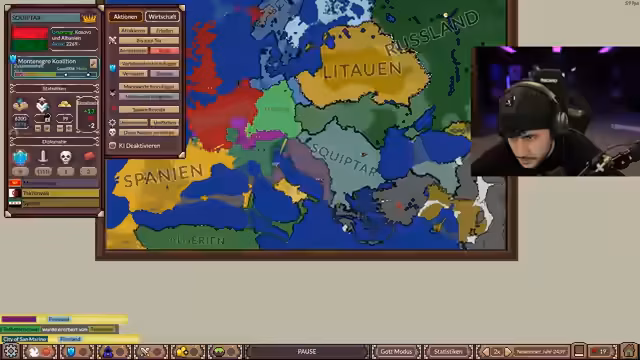 01:28:21Der Stream konzentriert sich auf eine komplexe Simulation, in der Nationen Kriege führen, sich verbünden und Land erobern. Der Kommentator berichtet über den Fall von Italien, das ihm Krieg erklärt hat, und den anschließenden Versuch, Frieden zu schließen. Er erweitert seine Allianz um Syrien, welches kurz darauf durch einen Aufstand gestürzt wird, und fängt an, Montenegro aufzufordern, ebenfalls in den Krieg einzutreten. Die Dynamik der Allianzen ist instabil, und es wird von ständigen Angriffen und Revolten berichtet, was zu einer zunehmenden Verwirrung und Frustration führt.