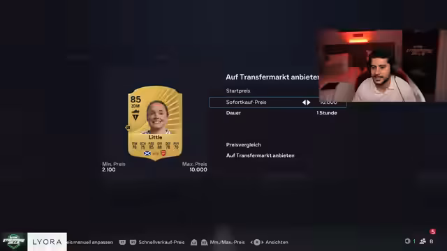 02:50:28Der Streamer wechselt zum Thema FIFA 26 Trading und investiert viel Zeit und Geld, um wertvolle Spieler zu ziehen oder günstig auf dem Transfermarkt zu erwerben (Sniping). Er diskutiert Preise, wie z.B. für Dembélé und Vinicius Junior, und berät sich mit seinem Chat, insbesondere mit "Achmed". Strategien wie das Warten auf das richtige Moment, um einen Spieler zu kaufen, oder das schnelle Verkaufen bei Gewinn werden analysiert. Er berichtet von finanziellen Investitionen und deutet an, dass sich die 5000 Euro, die er investiert hat, auf rund 18 Millionen Münzen vermehrt haben. Langfristiges Ziel ist es, Icons zu ziehen, die er dann für hohen Gewinn weiterverkaufen kann.