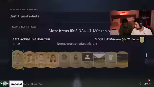 04:40:35Durchführung eines Pack-Battles als gemeinsames Event. Der Streamer zieht den Spieler Flurian Wirtz und verzeichnet einen Gewinn von 310.000 Coins. Die Preise im Markt als tot und günstig beschrieben, was zu Kaufempfehlungen führt. Nach dem Pack-Battle werden Wettschulden geregelt, insbesondere Faro muss 10 Subs bezahlen, und die Teilnehmer planen weitere gemeinsame Aktionen um 19 Uhr.