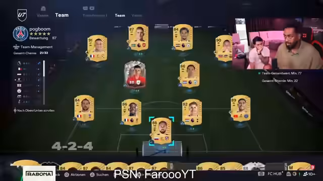 10:23:16Der Streamer gibt taktische Tipps zur Spielerwertung und kritisiert, dass einige Spieler wie Pelé im Spiel schlechte Passwerte haben, obwohl sie in Wirklichkeit gut sind. Er startet eine Auktion für einen Ballon-d'Or-Spieler und erwähnt den niedrigen Marktwert von Zidane. Nach einem Sieg im Bingo-Modus tauschen die Streamer Subs aus und klären die Schulden untereinander. Zudem wirft er einen Blick auf die Tageschallenges wie 'World Cup' und 'Warcode'.
