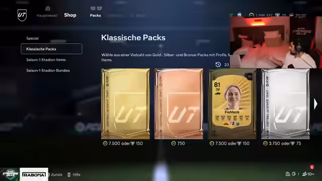 09:46:05Nach anfänglichem Pech beim Pack-Opening und leeren 'Points', einer Art virtuellem Währungssystem der Community, erlebt der Streamer einen Triumph. Er zieht die begehrten 'Hero'-Karte Gallagher und kurz darauf eine zweite 'Hero'-Karte, gefolgt von einer 'Icon'-Karte (Coutinho). Zwar verfehlt er den erwähnten R9, doch der Zug von Coutinho wird als 'Bounceback' gefeiert und als lukrativer Gewinn angesehen. Der Streamer ist sichtlich euphorisch über die gezogenen Karten und das Erreichen eines 'Jackpots'.