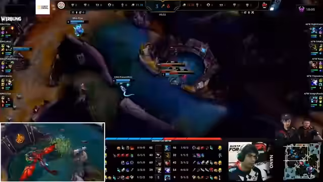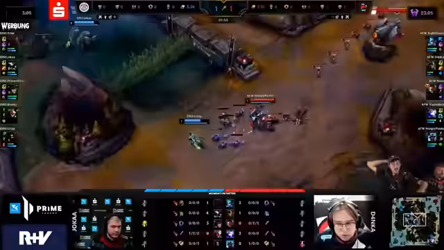 06:28:56Es wird der Fearless-Draft erklärt, bei dem gespielte Champions für die restliche Begegnung gesperrt sind, was zu kreativeren Teamzusammenstellungen zwingt. Im Best of Five wären 40 Champions gesperrt. Es wird betont, wie wichtig ein guter Draft ist. Es wird überlegt, eine Comfort-Comp zu picken, wie Orianna, Varus und Rell. Es wird die Frage aufgeworfen, ob man sich doppelt hört, was aber am Raum liegt. Es wird auf den Jungle-Pick eingegangen und die unterschiedlichen Spielertypen von Sanzara, Joker und Virgo verglichen. Es wird die Akali hervorgehoben, die sehr knallen kann. Es wird kurz auf Chase Hunt eingegangen. Es wird die Hymne gespielt und alle stehen auf. Daniel Bröckmann spielt sein erstes Ligaspiel für Eintracht Spandau. Tristan war von Bröke positiv überrascht.
