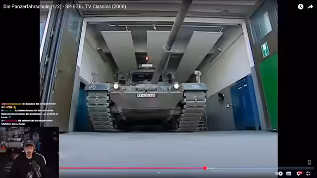 00:45:00Der Streamer gibt Einblicke in ein während der Corona-Zeit gegründetes, geheimes Kanalprojekt, in dem nur das Team lustige Videos produzierte, die sie nie beworben haben. Anschließend beginnt die Reaktion auf eine Spiegel-TV-Doku von 2008 über die Panzer-Fahrschule der Bundeswehr. Der Streamer, der selbst einen Panzerschein besitzt und schon Panzer gefahren ist, kommentiert die Ausbildung mit Begeisterung und ist fasziniert von der Realität des Panzerfahrens.