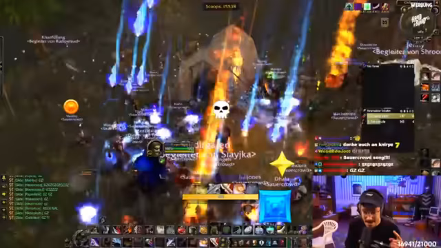 06:53:38Der Streamer beschreibt sein Gameplay in den östlichen Pestländern, er kämpft gegen mehrere Gegner auf einmal und greift Magier und Jäger an. Er merkt an, dass er auf Hardcore-Servern eher greedy ist und mehr Items mitnimmt. Er kämpft gegen Hyänen und ein fester Teil des Streams ist der Humor und die absurde Interaktion mit der Community, wie die Frage nach einem Salzstreuer oder die Diskussion über das Schicksal eines Guild Members, der angeblich gestorben ist.