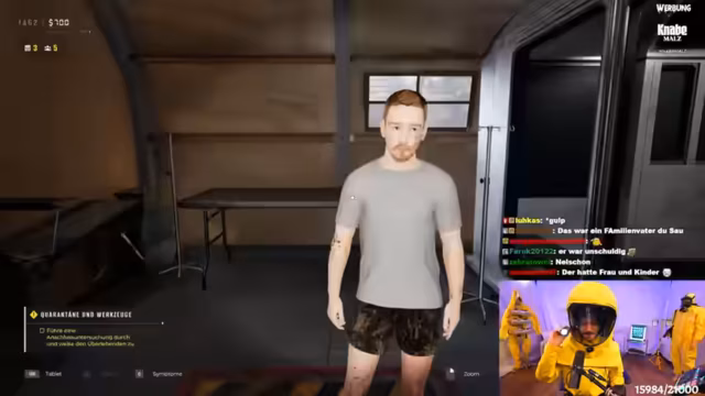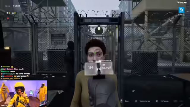 03:26:13Zu Beginn des Streams führt der Streamer, der als Arzt in einer Quarantänezone agiert, zahlreiche medizinische Untersuchungen durch. Er überprüft Vitalwerte wie Temperatur und Puls, testet Reflexe und beurteilt den körperlichen Zustand der Insassen, insbesondere Hautfarbe, Augen und eventuelle Verletzungen. Das Hauptaugenmerk liegt dabei auf der Erkennung von Infektionssymptomen wie gelben Augen oder Kratzern, die zur Einweisung in Quarantäne oder in schlimmeren Fällen zur sofortigen Liquidation führen können.