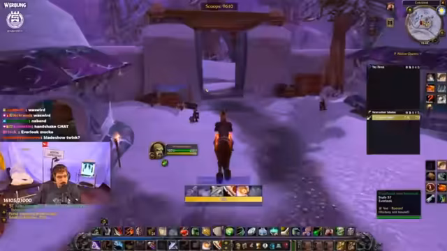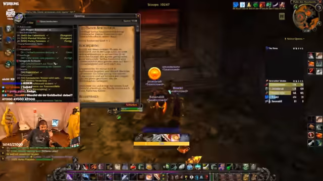 09:39:48Der Streamer beginnt einen Dungeon in der Brennenden Steppe, muss aber zunächst einem NPC im Camp mitteilen, dass er im Gefängnis ist. Nach der Annäherung an den Dungeon-Boss wird der Fokus auf eine bevorstehende Prinzessin Mara-Aktion gelegt, um einen Bissring zu farmen. Eine Diskussion über den Ring als bestes Schurken-Ausrüstungsstück und die Jagd nach einem "Thresh Blade" für einen Mitspielen schließt sich an.