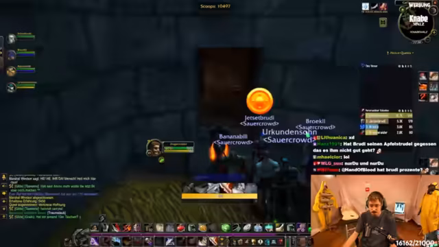 07:57:10Eine Schlüsselsequenz im Stream ist die Interaktion mit dem NPC Gefreiter Rocknott. Der Streamer muss ihm zweimal Bier geben, um eine Reaktion auszulösen. Danach randaliert der NPC, zerstört ein Fass und zieht die Wache auf sich, wodurch ein Bosskampf ausgelöst wird. Wichtig ist, während der Interaktion keine AE-Fähigkeiten zu verwenden, um keine Aggro auf die Wache zu ziehen.