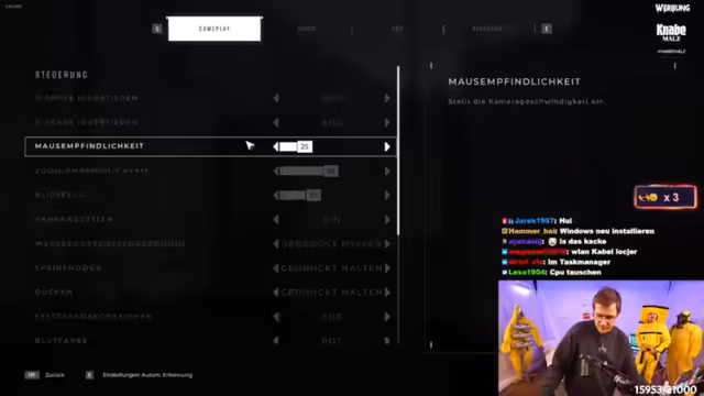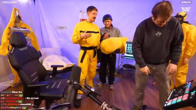 00:10:12Während des Streams treten mehrmals technische Schwierigkeiten auf, hauptsächlich mit dem Sound. Der Streamer und sein Team müssen das Mikro anpassen, da der Streamer durch den Schutzanzug gedämpft klingt. Auch Probleme mit der Capture Card und der Grafikperformance werden angesprochen und versucht zu beheben, um eine saubere Aufnahme für YouTube zu gewährleisten.