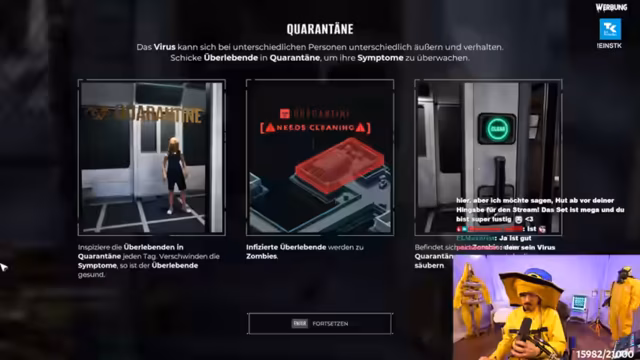00:15:30Der Hauptinhalt des Streams ist das Spiel 'Quarantine Zone', eine Art Grenzkontrollsimulation. Der Streamer erklärt die grundlegenden Spielmechaniken. Er muss als Inspektor Überlebende prüfen, sie basierend auf Symptomen in verschiedene Zonen (z.B. Quarantäne, Wohnbereich, Liquidierung) sortieren. Das Ziel ist es, das Camp vier Tage lang am Laufen zu halten und Überlebende zu evakuieren, während das Virus die Bevölkerung dezimiert.