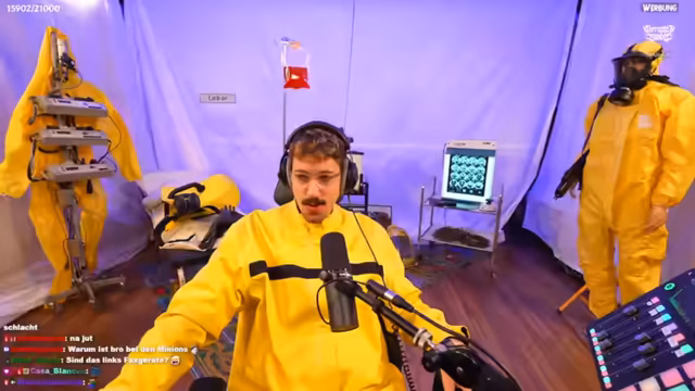00:14:05Der Streamer begrüßt seine Zuschauer und teilt mit, dass er krank ist und sich in Quarantäne befindet. Er leidet unter der fiktiven Infektionskrankheit 'Influenza Streamus 26'. Trotz seiner Erkrankung wird eine Hauptkanalaufnahme durchgeführt und der Streamer präsentiert einen neuen Teppich im Hintergrund. Die Stimmung im Chat ist aktiv, mit Grüßen und interaktiven Elementen wie dem Ballern von Clips.