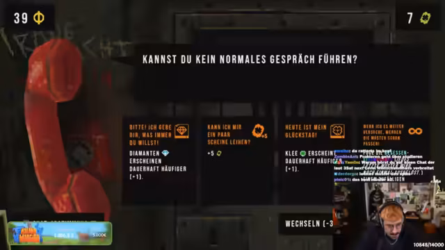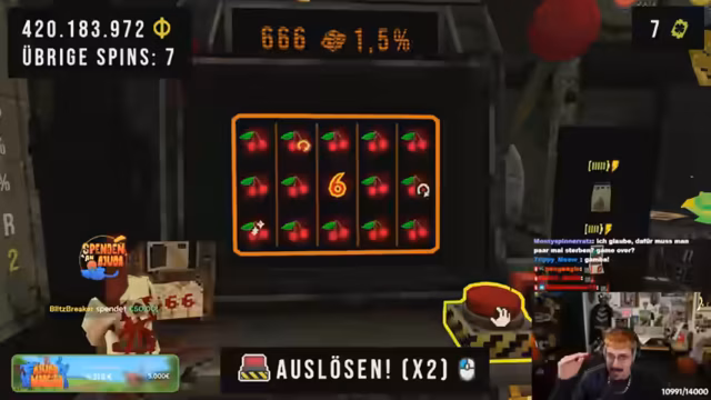 02:57:30Während des Streams analysiert der Streamer die Spielmechaniken detailliert. Er stellt fest, dass die Prozentuale Wahrscheinlichkeit der Symbole in einem Verhältnis von 100% zueinandersteht. Das bedeutet, wenn die Chance für Siebenden erhöht wird, sinkt die Chance für andere Symbole. Er untersucht die Effekte verschiedener Glücksbringer wie 'Schädel', der pro Leichenteil in der Schublade einen zufälligen Gratis-Glücksbringer gewährt, und 'Atomknopf', der alle ausgelösten Glücksbringer zusätzlich aktiviert. Diese Entdeckungen beeinflussen seine zukünftige Strategie erheblich.