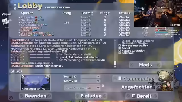 03:22:16Nach der ersten Runde analysieren die Spieler den Verlauf und machen Fehler beim Bauen von Verteidigungsanlagen. Bramir gibt an, überfordert gewesen zu sein und die Map nicht richtig verstanden zu haben. Die Kommunikation im eigenen Team ist ein Problem. Darauf folgt die Pick-und-Bann-Phase für die nächste Runde. Als Bann wird 'Hanno' ausgewählt. Bramir preist Aska, den Entwickler der Mod und der Karte, und hebt dessen Bedeutung in der deutschen Ford-Szene hervor. Die Teams werden mit bekannten Streamern wie Kurt, Simon, Sprotte und Robin besetzt, wobei die Rollen und Charaktere humorvoll umschrieben werden.