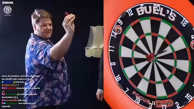 01:06:03Der Stream beginnt mit der Vorstellung neuer Darts von Bulls, die seit dem 21.03. käuflich erhältlich sind. Der Streamer präsentiert sein persönliches Set und betont deren hohe Qualität. Anschließend werden die beiden Gäste vorgestellt: Martin Schindler, der beste deutsche Dartspieler, und ein amtierender Champion der Influencer-Darts-WM. Gemeinsamen soll das Publikum in fünf Tipps eingeweiht werden, um das Dartspiel zu verbessern, wobei Bulls als Sponsor des Events genannt wird.