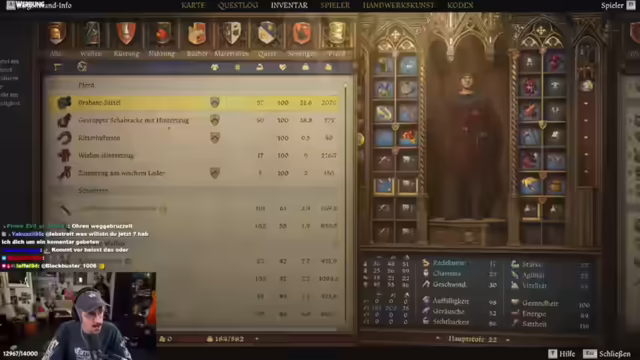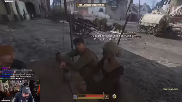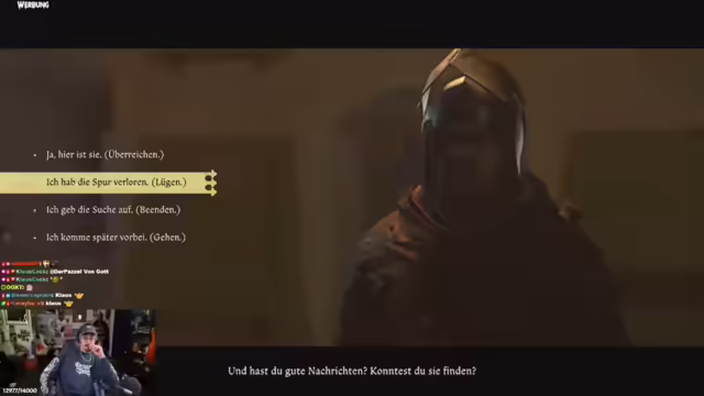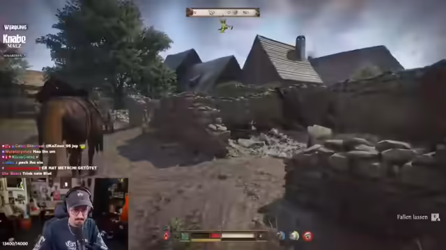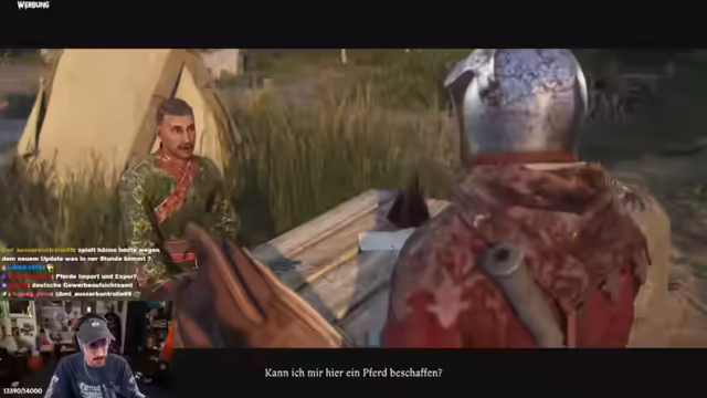 03:08:59Der Streamer kommentiert eine Szene, in der Menschen Hilfe anbieten und Uli mit der Kamera alles dokumentiert. Es folgt eine Begegnung mit einem Mann, der seinen Glauben an Jesus Christus bezeugt und erklärt, wie er durch den Glauben ein neues Leben gefunden hat. Der Streamer vergleicht ihn mit Ned Flanders aus den Simpsons. Er kommentiert den Jägermeister Konsum der Leute. Im Spiel konsumiert der Charakter Alkohol und wird betrunken, was zu verschiedenen Auswirkungen führt, wie verbesserte Stehlen-Fähigkeiten und verändertes Verhalten. Er beschreibt, wie er betrunken zum Pferdehändler geht, um ein neues Pferd zu kaufen, und dabei Schwierigkeiten hat, sich zurechtzufinden. Er tauscht sein Pferd Hering gegen ein neues Pferd ein und lobt das neue Pferd. Er muss ein Rätsel lösen und erinnert sich an Situationen, wenn man durchgefeiert hat und dann Samstag früh durch die Altstadt langsam nach Hause geht und man trifft auf dem Markt einfach die Eltern vom Bro oder so. Er bekommt Tipps für Trinkgelage und das beste Mittel gegen einen Kater ist Knoblauchsuppe.