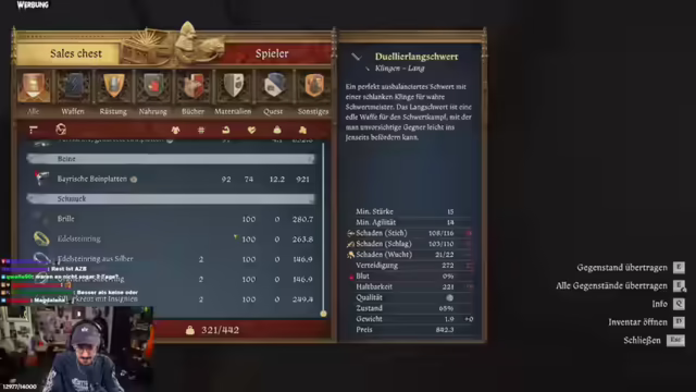 07:06:26Es wird ein edles Schwert geschmiedet, wobei der Fokus auf Konzentration und Präzision liegt. Nach der Fertigstellung wird das Schwert als außergewöhnlich hochwertig beurteilt. Es wird ein Kunde bedient, der das Schwert bestellt hat, um seinen Nachbarn zu beeindrucken. Der Kunde ist begeistert und zahlt einen hohen Preis für das Schwert. Es wird ein Gespräch mit einem NPC geführt, der den Charakter auf ein Stadtturnier aufmerksam macht. Es wird festgestellt, dass der Kunde nicht als Gehilfe fungiert. Es wird die Gießerunterkunft ausgebaut. Es werden verschiedene Erweiterungsoptionen für die Schmiede erkundet, wie zum Beispiel ein Alchemie-Schuppen, eine Räucherkammer, ein Stall und Bienenstöcke. Es wird festgestellt, dass neue Sachen freigeschaltet werden, wenn man Sachen baut. Es wird ein Ladenschild aufgehängt. Der Stream wird beendet und die Zuschauer werden zu einem anderen Streamer weitergeleitet.