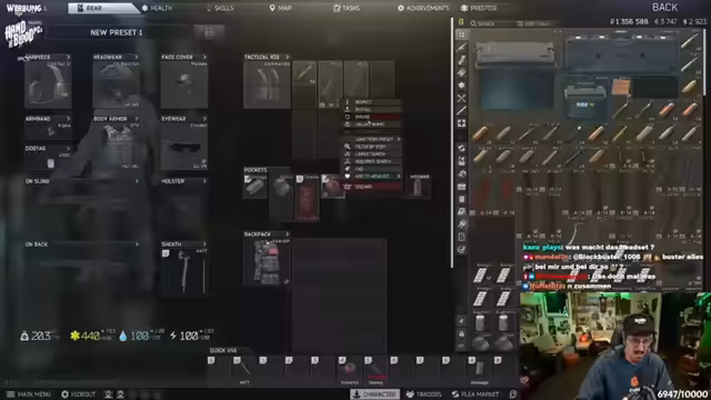 05:14:40Nach einem erfolgreichen Raid muss der Streamer seinen umfangreichen Loot verwalten. Er sortiert unnötige Gegenstände wie Käse und Bandagen aus, da er größere Heilungsgegenstände nutzt. Er verkauft überschüssige Magazine und Schalldämpfer, die er im Spiel nachkaufen kann. Dog-Tags sammelt er für eine zukünftige Quest, bei der sieben benötigt werden. Deswegen behält er sieben Tags, egal von wem stammen. Er zeigt auch ein spezifisches Gebäude auf Carstens mit großem Loot-Potenzial, das er bevorzugt, weil man hier eine gute Map-Übersicht hat.