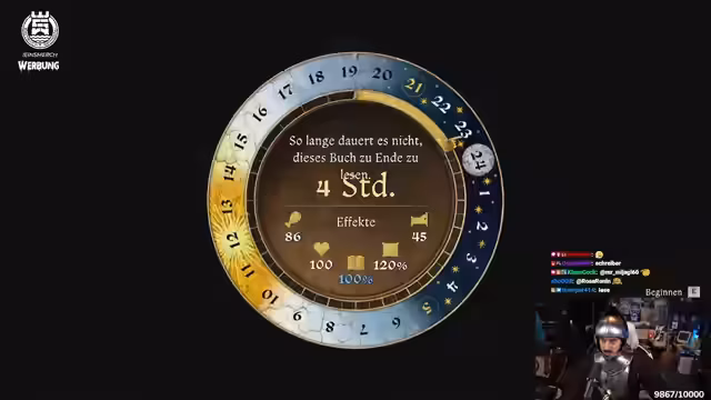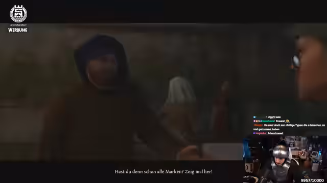 04:02:40Nach einem weiteren Turnierkampf erhält der Streamer eine Belohnung, verliert aber auch wertvolle Gegenstände wie eine Halskette und sein Schwert. Die Suche nach dem gestohlenen Schwert führt ihn zu verschiedenen Verdächtigen, darunter Hans und ein Räuberbaron. Die Ermittlungen gestalten sich schwierig, da viele Zeuginnen den Täter nur vage beschreiben können. Letztlich muss der Streamer feststellen, dass der Täter das Schwert in eine Jauchegrube geworfen hat.