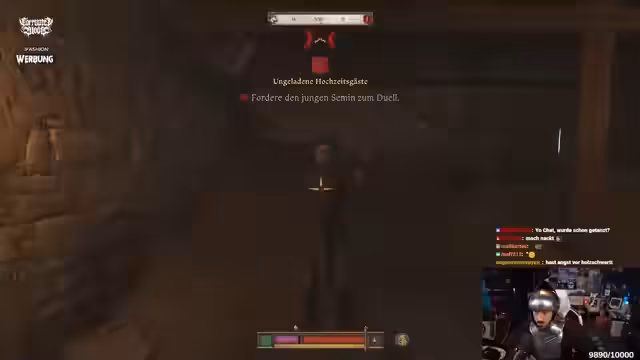 03:27:09Auf der Hochzeit findet ein Turnier statt, an dem der Streamer teilnimmt. Nach gewonnenen Kämpfen trifft er auf Mischka, die er in einem Gedicht-Battle überzeugen kann. Später erhält er die Quest, Bettler von der Hochzeit zu entfernen. Indem er Küchenabfälle organisiert und sie damit versorgt, erfüllt er diese Aufgabe erfolgreich. Die Rufverschlechterung durch die Bettler wird durch einen Perk kompensiert.