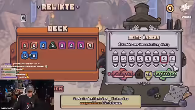 00:29:39Während des Spiels werden die komplexeren Mechaniken von Dine the Dungeon erklärt. Energie wird benötigt, um Würfel auf das Spielbrett zu legen. Verschiedene Würfel-Typen wie Angriff, Block und Boost haben unterschiedliche Funktionen und Reichweiten. Geländewürfel erzeugen permanente Felder, die den Wert benachbarter Würfel beeinflussen. Moderne Würfel können nur einmal pro Kampf verwendet werden. Der Streamer experimentiert mit dem Deck, Würfel werden ausgemistet und durch bessere ersetzt, um die Ziehungswahrscheinlichkeit zu erhöhen. Es werden auch Charaktere und Relikte vorgestellt, die das Spiel beeinflussen.