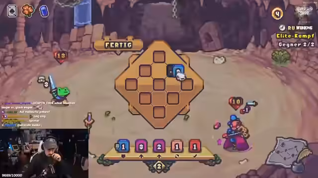 01:21:23Der Streamer spielt ein Brettspiel-ähnliches Indie-Spiel und schildert seine Züge im Detail. Er kämpft gegen Gegner, platziert Würfel auf einem Spielbrett, um Angriffswerte zu erhöhen oder Schaden zu reduzieren. Entscheidungen, wie man Würfel boosten oder welche Felder man nutzt, haben direkten Einfluss auf den Kampfverlauf und den Schaden, der erhalten oder verursacht wird. Die Kämpfe erfordern taktisches Denken und das Anpassen der Strategie an die sich verändernden Bedingungen des Spielfelds.