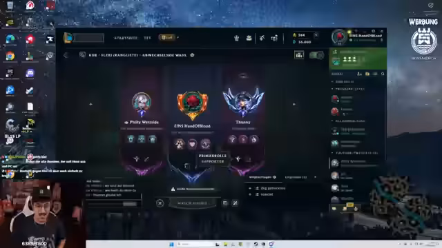 03:14:00Der Streamer versucht, eine Flex-Queue-Gruppe mit Tolkien, Kutscha und Toni aufzubauen. Nach anfänglichen Schwierigkeiten, einen fünften Spieler zu finden, wird ein Account namens 'Arceus' im Discord entdeckt, der nicht ihm gehört. Nachdem das Spiel beginnt, stellt sich heraus, dass es sich um den account des Streamers 'Toni' handelt, der stattdessen Fußball schaut, was zu humorvollen Reaktionen und Diskussionen führt.