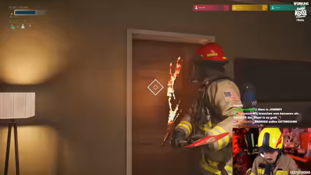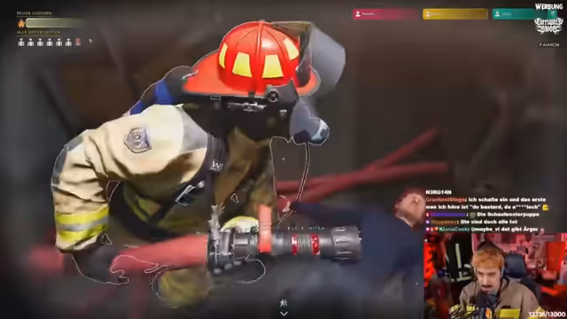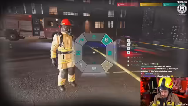 04:37:27Der Stream beginnt mit einer Simulation eines Feuerwehreinsatzes, in der der Streamer einen Raum inspiziert und versucht, ein brennendes Objekt zu löschen. Dabei interagiert er mit Chat-Beiträgen, beantwortet Fragen und führt das Publikum durch den Ablauf. Es werden Themen wie Ausrüstung, Organisation und das Löschverfahren angesprochen, wobei die Atmosphäre durch die Musik und die Kommentare des Streamers geprägt ist.