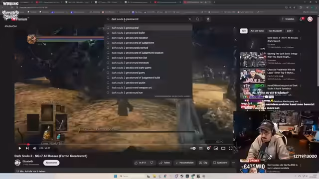 05:21:47Während seines 'Dark Souls 3'-Let's Plays äußert der Streamer eine gewisse Unzufriedenheit mit der Struktur des Spiels. Er findet es im Vergleich zu den Vorgängern 'extrem linear', da es nur einen vorgegebenen Pfad gibt und kaum alternative Routen oder 'Path-Varianten'. Das schränkt für ihn die Wiederspielbarkeit ein. Dennoch lobt er die Bosskämpfe für ihre Dynamik und vergleicht sie positiv mit anderen Spielen. Eine große Belohnung nach dem Sieg über die Abyss-Watcher sind deren Seelen, die entweder für die Freischaltung von mächtigen Bosswaffen wie dem Faron Greatsword oder Wolfknights Greatsword eingetauscht werden können.
