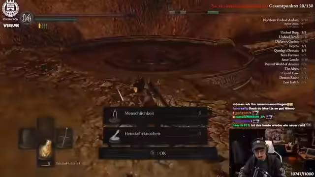 01:00:17Es wird sich über die beleidigenden Worte aufgeregt. Es wird überlegt, ob erst Havel oder die Hydra gemacht werden soll. Es wird sich über die Hydra lustig gemacht. Es werden Bomben eingesetzt. Der Arm der Hydra hat weniger Health Pool als der ganze Boss. Es wird über die beste Waffenwahl diskutiert. Es wird sich über die Lore in Dark Souls lustig gemacht. Es wird eine Wette gemacht, ob man es schafft, lebend durch die Katzen zu rennen. Es wird ein heißer Tipp von Maxi Markow erwähnt, dass die hier wohl Goldharz droppen. Es wird sich über Holler lustig gemacht. Es wird sich über Viewer aufgeregt, die im Internet eine große Fresse haben, aber nichts beweisen können. Es wird über Viewerbotting diskutiert. Es wird über Pilze sammeln im Wald gesprochen. Es wird überlegt, ob man durch die Tiefen rennen kann.
