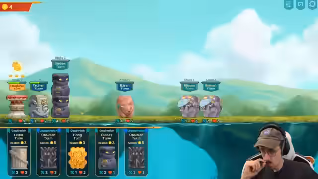04:00:27Es wird überlegt, den Milchturm hinter den Blumenturm zu tun, um Bienen hinzupacken und Honig zu pumpen. Der Obsidian-Turm wäre hier besser. Der Blumenturm gibt 5 EP und dadurch 5 Gold. Der Obsidian-Turm macht die temporären Boni zu permanenten. Es wird dem Obsidian-Turm plus 2 plus 2 gegeben. Es wird gererollt und eine Biene gefunden. Ab jetzt kann Honig bekommen werden. Solange der Obsidian-Turm Stufe 1 ist, gibt es einen Turm weniger im Shop. Der Obsidian-Turm ist deutlich stärker und gibt noch mehr Stats ab. Es wird über den Eier-Turm nachgedacht. Es wird voll auf das Bloom Obsidian Turm Setup gesetzt. Es wird ein Wächterturm platziert, da er bei seinem Tod allen temporär plus 1 plus 1 gibt und der Obsidian-Turm das dauerhaft erhält. Der Wächterturm wird durchgeboostet. Es wird dem Bienenturm plus 4 plus 3 gegeben. Der Wächterturm stirbt und der Obsidian-Turm kriegt Dauer plus 1 plus 1. Es wird ein Diebes-Turm gebraucht. Der Honig wird geschmiedet und der Blumenturm kriegt plus 5, plus 5 dauerhaft und gibt 20% seiner Stats ab.