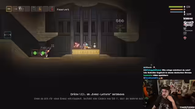 01:48:05Nach technischen Vorbereitungen beginnt der Stream offiziell mit einer Begrüßung der Zuschauer. Der Streamer begrüßt seinen Mitspieler Keklack, den er als einzigen deutschsprachigen Neuter-Spieler, den er kennt, vorstellt. Die Grundregeln für den Stream werden festgelegt: kein Friendly Fire und geteiltes Gold. Beide Spieler stellen ihre Erfahrung als knapp über 100 Stunden im Spiel heraus und sehen sich innerhalb der Noita-Community alsVeteranen, aber innerhalb der spezifischeren Neuter-Community als Neueinsteiger.