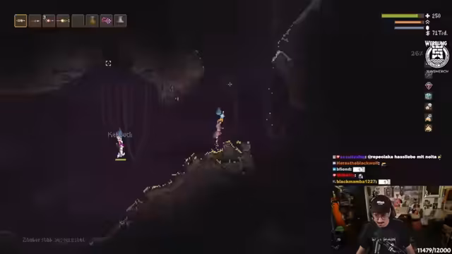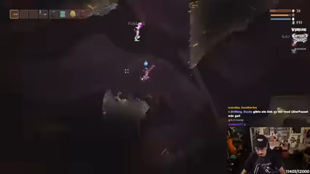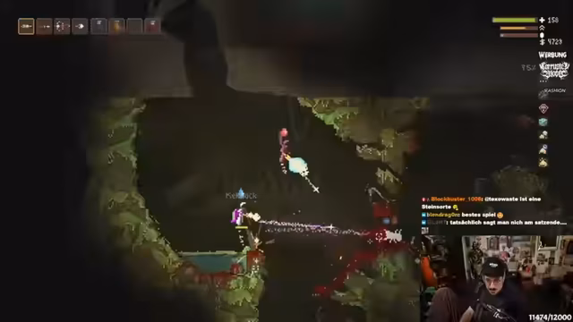 03:10:14Eine zentrale Idee des Streams ist der sogenannte Bloodmage-Trick. Dafür wird Ambrosia benötigt, um sich auf 1 HP zu reduzieren, und ein Herzcontainer. Wenn man von gegnerischen Mages getroffen wird, die die Lebenspunkte halbieren, multipliziert sich das maximale Leben durch das Aufheben des Containers um das Achtfache. Mit Map-Hack werden Blutmagier gesucht, um diesen Trick umzusetzen, und auch ein Wurm-Boss als potenzielle Zauberschlebenquelle wird ins Auge gefasst.