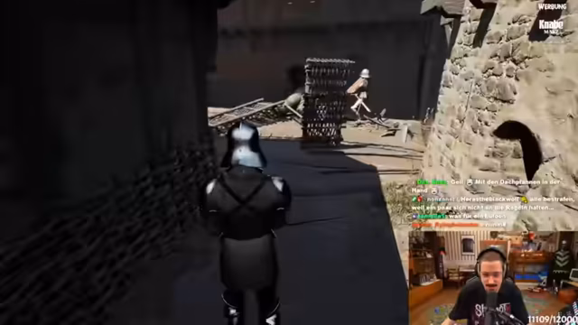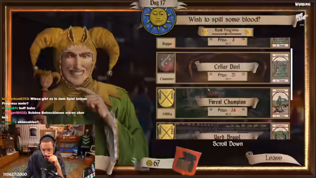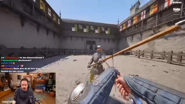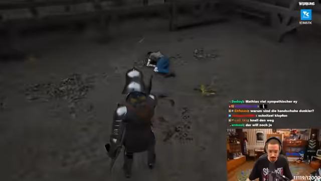 02:19:10Der Streamer kehrt zum Gameplay zurück und nutzt einen Händler, um Söldner für Turniere anzuheuern. Gezielte Kämpfe, wie ein Keller-Duell, werden zur Geldbeschaffung genutzt. Ein neuer, mächtiger Gegner namens Volker taucht auf und wird zum Hauptziel, dessen Ausrüstung zu erbeuten. Der Kampf ist chaotisch und brutal, und trotz der Erfolge wird die Ausdauer der Gegner und die Gefahr der Axtwaffe als sehr hoch eingestuft.