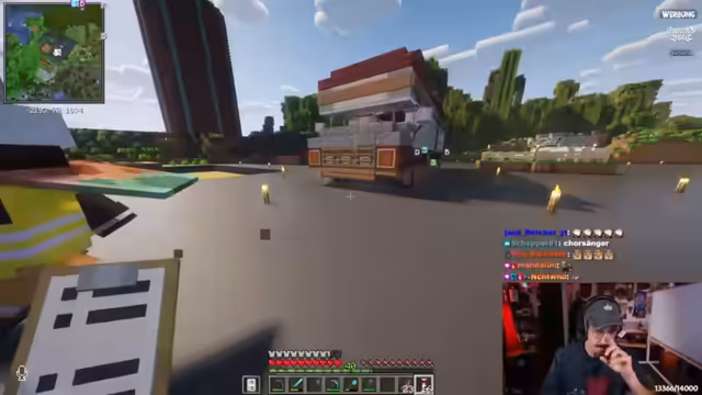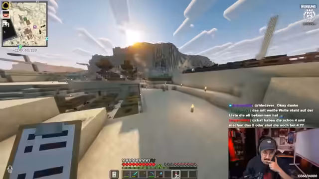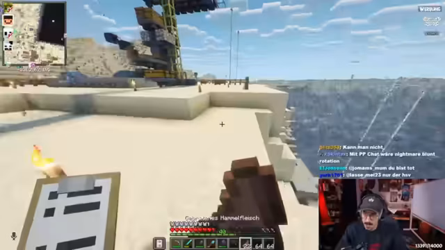 02:33:20Der Streamer arbeitet mit JoeCraft zusammen, der Wolle für ein Bauprojekt liefert. JoeCraft trägt eine Netherite-Rüstung, die durch ein Texture-Pack wie eine Bauuniform aussieht, komplett mit Warnweste und Baustellenhelm. Die Wolle wird für den Bau eines Games in einem geplanten Freizeitpark benötigt. Der Freizeitpark soll auf einer riesigen Insel entstehen, die noch terraformt werden muss. Ein Freefall Tower ist bereits gebaut, um einen Überblick über das zukünftige Gelände zu geben. Der Streamer plant, ein Spiel zu entwickeln, bei dem die Wurfweite von Schneebällen gemessen wird, um Wettbewerbe zu veranstalten und Rekorde aufzustellen. Dafür werden rote und weiße Wollblöcke mit Strings verbunden, um die Weite mittels Redstone zu messen. JoeCraft wird als einer der Ersten das Spiel ausprobieren dürfen.