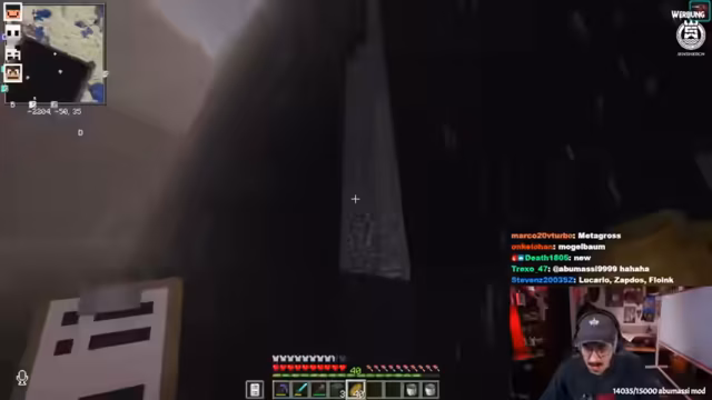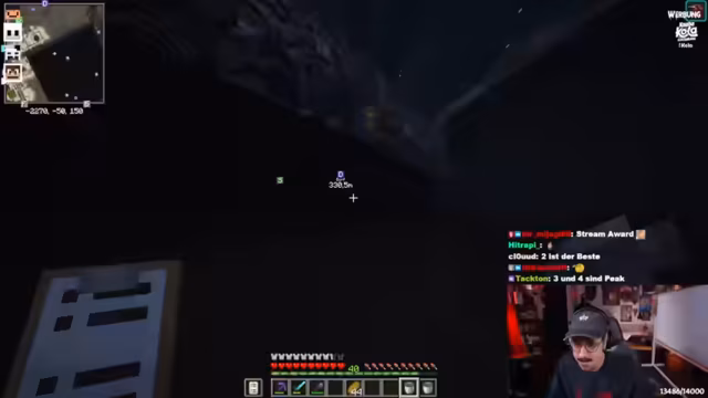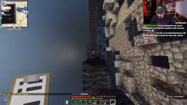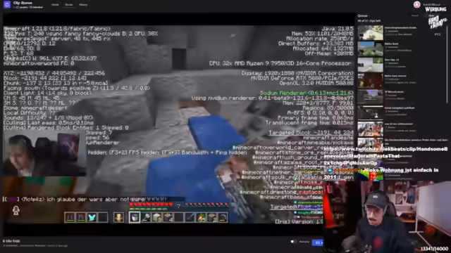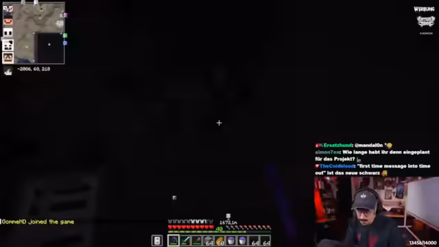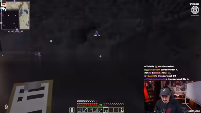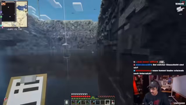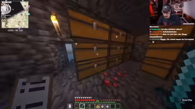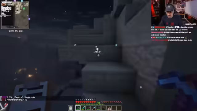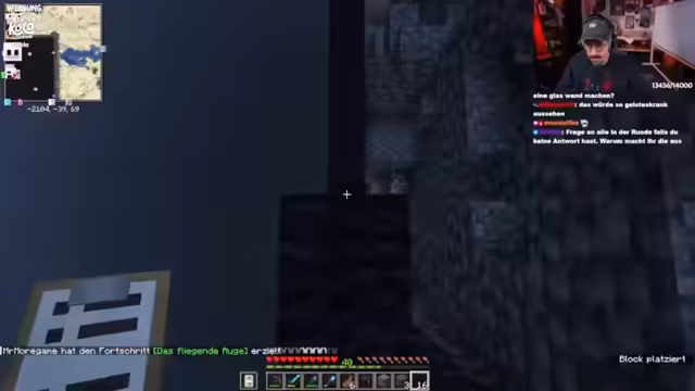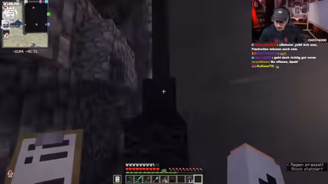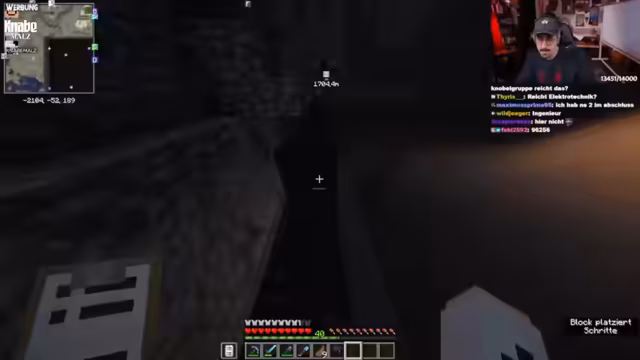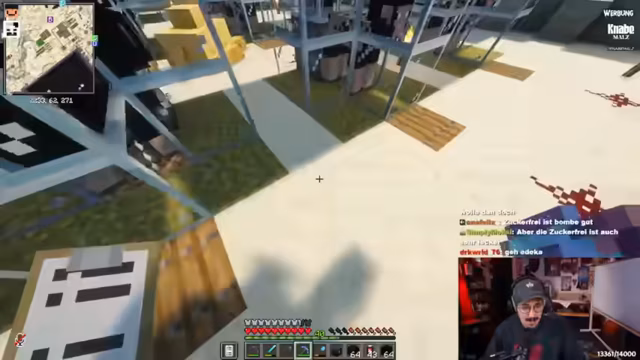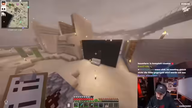 00:51:09HandOfBlood berichtet über seine Arbeit am 'Die Säulen'-Server in den letzten zwei Tagen. Er hat ein Add-on namens 'Säulen GmbH.zip' heruntergeladen, das ein Texture-Pack enthält, welches die Netherite-Rüstung in eine Bauuniform mit Warnweste und das Totem of Undying in ein Klemmbrett verwandelt. Er erklärt, dass die Netherite-Rüstung nur für ihn so aussieht, da es sich um ein Texture-Pack handelt. Er zeigt das riesige Loch, das für Akt 3 des Projekts gesprengt wurde. Das Loch hat mehrere Schichten Glas und einen schwarzen Teppich, der später mit Shadern glühen soll. Er diskutiert mit einem anderen Spieler über die Effizienz beim Platzieren von Blöcken und die unterschiedlichen Maus- und Tastaturbelegungen. Es wird eine Umfrage im Chat gestartet, wie die Zuschauer ihre Maus halten. HandOfBlood äußert seine Verwunderung über die verschiedenen Spielweisen und die Gewohnheit, die sich im Laufe des Zockerlebens entwickelt.