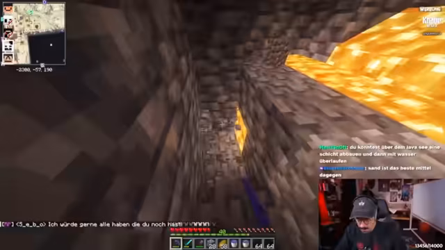05:50:04Die Diskussionen um die Lavaseen und deren Auswirkungen auf den Bau der Säulen nehmen einen zentralen Platz ein. Es stellt sich heraus, dass die ursprüngliche Information, zwei Blöcke Abstand zwischen Wolle und Lava seien sicher, falsch ist. Dies führt zu wiederholten Bränden, die den Bau erheblich behindern. Die Wolle, die in großen Mengen platziert wurde, fängt immer wieder Feuer. Die Teammitglieder sind frustriert über die unzureichenden Informationen und die daraus resultierenden Probleme. Es wird überlegt, wie man die Lava am besten eindämmen kann, wobei Sand als effektiveres Mittel als Wasser diskutiert wird, um die Lava im Keim zu ersticken. Die Situation ist angespannt, da die Sicherheit des Bauvorhabens durch die unberechenbare Lava gefährdet ist.