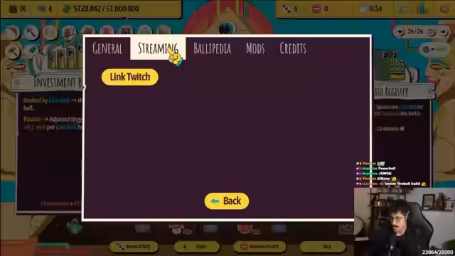 00:36:12HandOfBlood beginnt mit dem Spielen des Indie-Games 'Bollionär', das er als Dopaminschleuder bezeichnet. Er erklärt die grundlegenden Spielmechaniken, die an Pinball oder Pachinko erinnern. Das Ziel ist es, in einer begrenzten Anzahl von 'Drops' (Spielrunden) ein bestimmtes Geldziel zu erreichen. Jeder Drop startet mit einer Illuminati-Augenkugel, die als Ball dient und an verschiedenen Triggern abprallt, um Geld zu generieren. Nach jedem Drop kann der Spieler einen von drei zufälligen Triggern auswählen und an den Nöppeln anbringen, um spezielle Effekte auszulösen, wenn der Ball sie berührt ('ditcht'). Er erklärt verschiedene Trigger-Typen, wie das 'Jump Rope' (Springseil), das Geld und einen kleinen Aufwärts-Bounce gibt, den 'Pinball-Bumper', der den Ball abprallen lässt und Geld gibt, den 'Baum', der den Geld-Multiplikator mit jedem Drop erhöht, und den 'Teleporter', der den Ball zu einem anderen Teleporter auf dem Feld teleportiert. Er simuliert einen Drop, um die Funktionsweise der Relikte zu demonstrieren, die die Gravitation umkehren, wenn der Ball das Board verlässt, ohne einen Trigger zu berühren. Er wählt einen Brick-Trigger, der einen zweiten Ball spawnt, wenn er von unten berührt wird, und einen Teleporter, um die Strategie zu demonstrieren.
