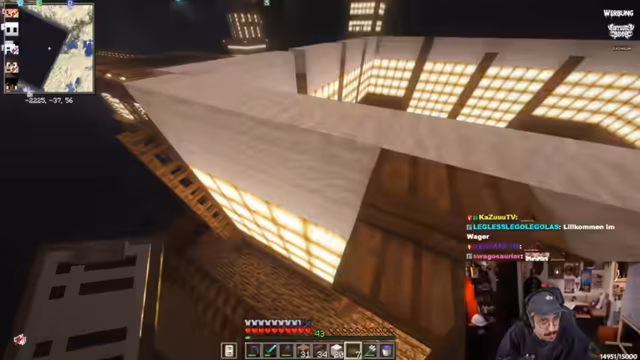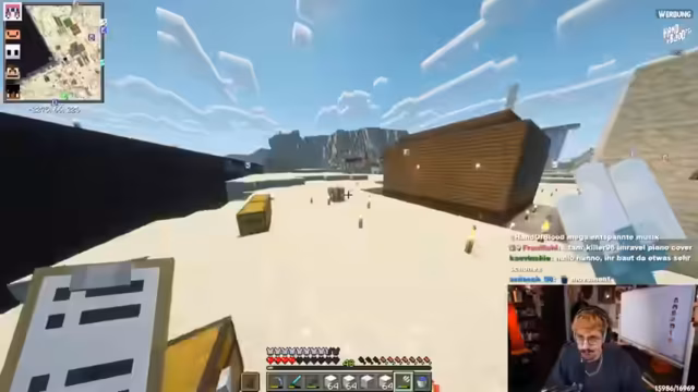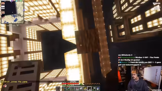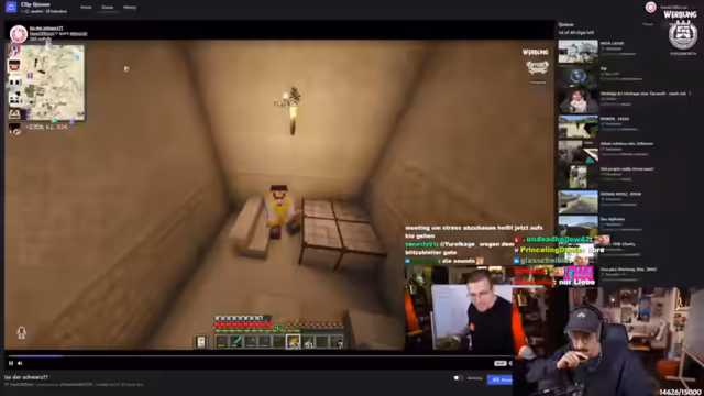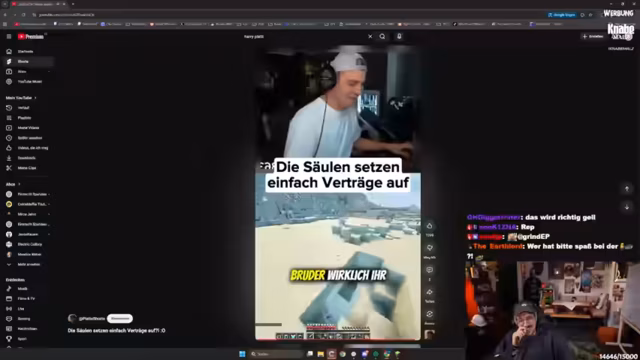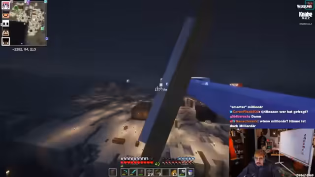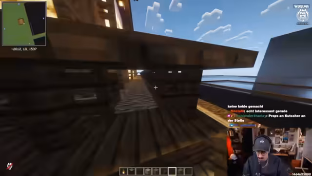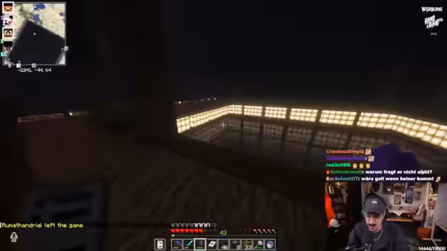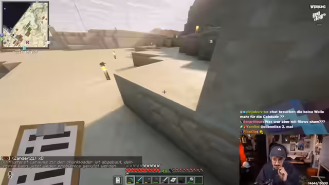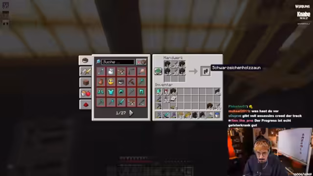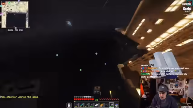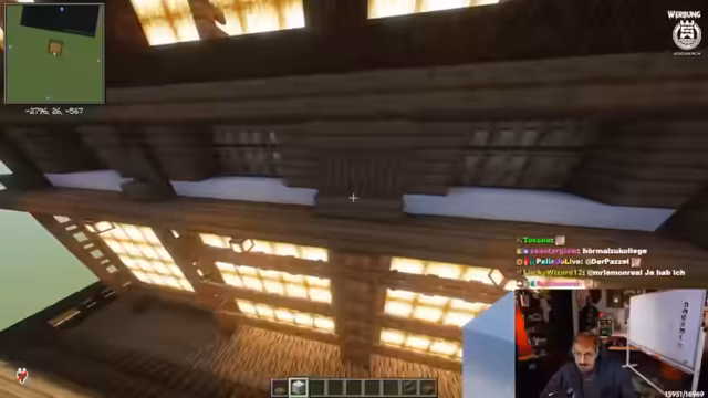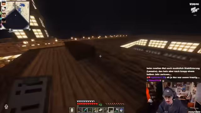 02:03:55Der Streamer widmet sich der Installation und Nutzung einer Autosortierungs-Mod, um sein Inventar effizienter zu verwalten. Er stellt fest, dass die 'Inventory Tweak'-Mod bereits installiert ist, aber er sich nicht an die Bedienung erinnert. Nach kurzer Suche und Hilfe aus dem Chat entdeckt er, dass die mittlere Maustaste zum Sortieren dient, was er als 'satisfying' und 'wirklich wichtig' empfindet. Er beschreibt auch sein Multi-Monitor-Setup: einen Bildschirm zum Zocken, einen für den Chat und Discord, einen für OBS auf dem Streaming-Rechner und einen großen Fernseher für den Chat, besonders für Gäste. Währenddessen führt er Gespräche mit anderen Streamern. Carawass meldet sich, um zu fragen, wann der Streamer Zeit für ihn hat, um ihm seine 'Armee' zu zeigen. Der Streamer verspricht, sich zu melden, sobald er ein Haus fertig gebaut hat. Ein weiterer Streamer, der nicht namentlich genannt wird, aber als 'Säule' bezeichnet wird, kommt in den Call und fragt nach Schwarzeiche. Es stellt sich heraus, dass das Holzlager leer ist und die Ressourcen bei den Farmen verstreut sind. Ein Spieler namens Veto hat zwei Frösche für die 'Säulen GmbH' gespendet, was als 'illegale Firmenspende' bezeichnet wird, aber dankbar angenommen wird, da ein Creeper zuvor die eigenen Frösche zerstört hatte. Willi kommt ebenfalls in den Call und berichtet, dass er sein Haus fertiggestellt hat, ohne Schablone, was der Streamer beeindruckend findet.