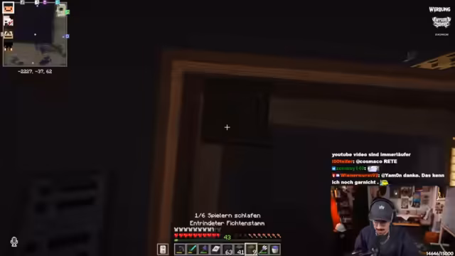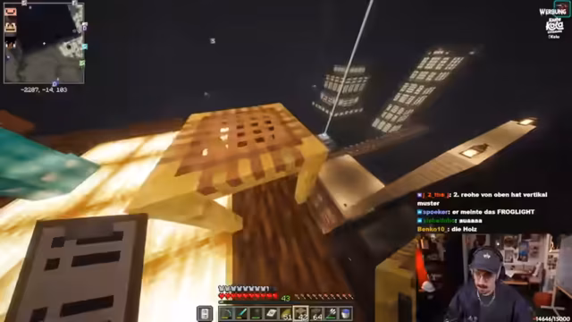 02:57:46Während des Minecraft-Streams stoßen die Spieler auf eine unerwartete Herausforderung: die Maserung der Holzblöcke. Der Chat macht auf die inkonsistente Ausrichtung der Holztexturen aufmerksam, was zu einer lebhaften Diskussion und Frustration führt. Besonders die korrekte Platzierung der Holzblöcke, damit die Maserung in eine einheitliche Richtung zeigt, erweist sich als schwierig und zeitaufwendig. Der Streamer und seine Mitspieler experimentieren mit verschiedenen Platzierungstechniken, um die gewünschte Ausrichtung zu erreichen, was zu humorvollen, aber auch genervten Kommentaren führt. Die Detailverliebtheit der Zuschauer und die Komplexität der Minecraft-Mechaniken in Bezug auf Blockplatzierung werden hier deutlich. Die Spieler müssen sich intensiv mit der Mechanik auseinandersetzen, um die ästhetischen Anforderungen der Community zu erfüllen, was den Bauprozess erheblich verlangsamt und die Nerven der Beteiligten strapaziert.