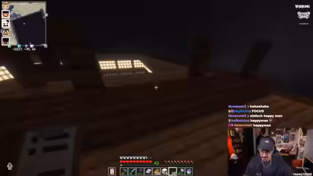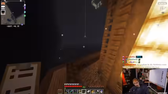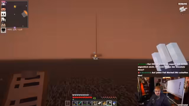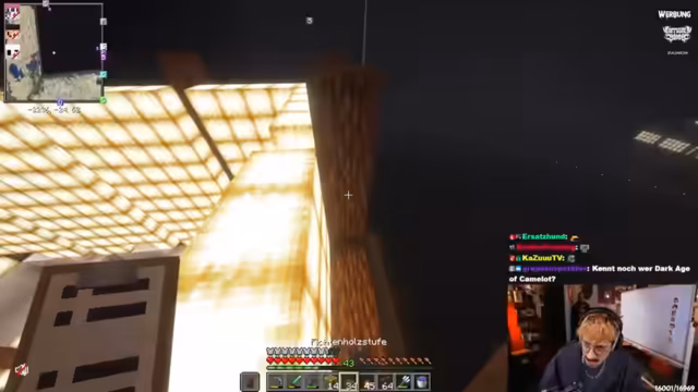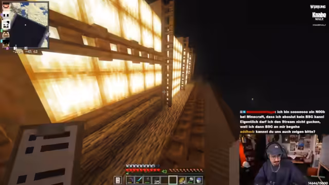 08:28:48Der Bau des 'Empire State Building' im Spiel erweist sich weiterhin als anspruchsvoll, insbesondere bei der Verwendung von 'Schwarzeichenholzstufe umgedreht' und 'Schwarzeichenholzzaun', was zu Materialengpässen führt. Der Streamer experimentiert mit verschiedenen Bauweisen und sucht nach effizienten Lösungen, um das riesige Gebäude fertigzustellen. Die musikalische Untermalung bleibt ein zentrales Element des Streams, wobei Gaming-Soundtracks wie 'Eldenringmucke' die Atmosphäre prägen. Die Interaktion mit dem Chat ist geprägt von Humor und gegenseitigem Neckereien. Es werden Witze über 'Kevin-Push' und 'Techno-Abend-Club-Event' gemacht, und der Streamer reagiert auf die Vorschläge und Kommentare der Zuschauer. Eine Anekdote über ein 'Müsli-Abfuck' und die Reaktionen von weiblichen Zuschauern darauf sorgt für Belustigung. Der Streamer reflektiert über seine Rolle als 'Lehrer' für seinen Chat und wie er sie von 'widerlichen Normies' zu eigenständigen Individuen geformt hat. Die Schwierigkeiten bei der Beschaffung von Materialien wie 'Eiche' und 'Laternen' werden thematisiert, und der Streamer sucht nach kreativen Lösungen, um den Bau fortzusetzen.