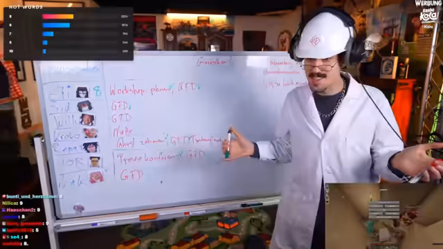 08:41:46Der Streamer teilt persönliche Reflexionen über seine Erfahrungen als Streamer, darunter die Herausforderungen von 'ADHS' und die Notwendigkeit von Disziplin. Er erzählt von einem 24-Stunden-Stream aus dem Jahr 2014-15, bei dem er versuchte, in League of Legends den Dia-Rang zu erreichen, während er ständig 'gededost' wurde. Diese Anekdote beleuchtet die damaligen Schwierigkeiten und die Entwicklung der Streaming-Landschaft. Die Interaktion mit dem Chat bleibt humorvoll und selbstironisch, wobei der Streamer auf Kommentare über seine 'KI' und seine Bauweise eingeht. Er teilt Tipps zur Beschaffung von Materialien wie 'Laternen' und 'Äxte' und reagiert auf humorvolle Weise auf 'Fanny'-Kommentare mit 'Tages-Timeout'. Eine weitere Anekdote über ein 'Müsli-Abfuck' und die Reaktionen von weiblichen Zuschauern darauf sorgt für Belustigung. Der Streamer reflektiert über die Notwendigkeit, sich nach einer halben Stunde zu 'entmuten' und die 'geile Zusammenarbeit' im Chat. Die Diskussion über die besten Gaming-Soundtracks wird fortgesetzt, wobei der Streamer seine persönlichen Favoriten teilt und die Zuschauer zum Raten auffordert.