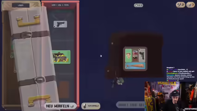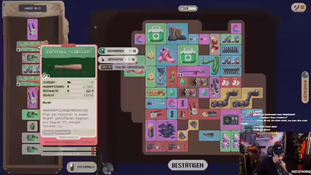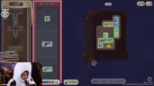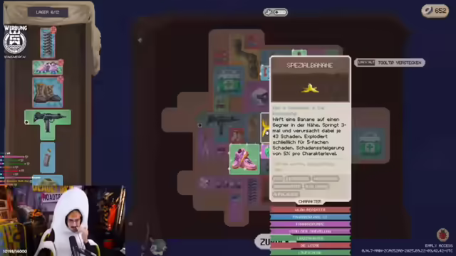 02:33:27Der Streamer erklärt die Spielmechanik von Deadly Days Roadtrip, beginnend mit dem Inventarsystem, das durch Rucksäcke erweitert werden kann. Auf der Map sammelt man Schrott (die Währung), Benzin (um die Map zu verlassen) und Items. Items aus dem Lager sind erst nach dem Extrahieren aus einer Runde verfügbar. Die übergeordnete Map ähnelt Slay the Spire. Items interagieren miteinander, wobei Sterne auf den Items anzeigen, welche Effekte auf andere Items übertragen werden. Item-Tags geben Auskunft über die Eigenschaften der Items, wie z.B. Wurfwaffe, Sprengstoff oder auslösbar. Die Rollschuhe erhöhen die Bewegungsgeschwindigkeit und lösen Items in den Sternen beim Dashen aus. Der Streamer erklärt, dass man die Item Tags angucken muss.