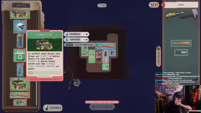 05:33:20Zunächst wird ein Problem mit der Breite der Chatdarstellung angesprochen, bei dem die Schrift sehr klein und schwer lesbar ist. Anschließend wird erklärt, wie man den Presi-Code im Spiel eingibt: Im Hauptmenü findet sich unten links ein Schlüsselsymbol, nach dem Anklicken kann der Code "erst knackt's, dann knallt's" eingegeben werden. Es wird überlegt, welche Items für den Charakter am besten geeignet sind, wobei verschiedene Waffen und Ausrüstungsgegenstände in Betracht gezogen werden. Der Fokus liegt darauf, die Effektivität im Kampf gegen Zombies zu verbessern und die Überlebenschancen zu erhöhen. Es wird diskutiert, ob bestimmte Items wie Rüstungsschuhe nützlich sein könnten, insbesondere im Hinblick auf ihre Fähigkeit, Gegner wegzustoßen. Die Überlegung, die Map mit Tab größer zu machen, wird angesprochen, aber es wird festgestellt, dass dies wahrscheinlich keinen großen Unterschied machen würde, da es sich eher um ein Radar handelt.