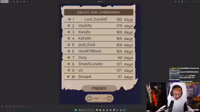 05:01:33Es wird über Balancing-Anpassungen im Early Access Release von Deadly Days gesprochen und die Spannung auf die morgige Global Highscore-Liste geäußert. Es gibt Überlegungen, wie das Leaderboard interessanter gestaltet werden könnte, z.B. durch die Anzeige des Inventars oder des Death-Screens des Spielers. Die Idee eines Stempels vor dem Namen, der den gespielten Charakter oder Build kennzeichnet, wird diskutiert. Es wird über Verschwörungstheorien bezüglich der Verbindung zu den Gamedevs und dem Offstream aufgestellten Rekord gesprochen. Die Identität von Gandalf, einem Spieler mit vielen Tagen im Spiel, wird enthüllt. Es werden Community-Ideen für Fun-Builds und die Verbesserung von Wurfwaffen diskutiert. Die Batterie und der Flummi sollen für Wurfwaffen funktionieren. Es wird überlegt, wie man Wurfwaffen verbessern könnte, z.B. durch neue Items, die die Flugdauer verkürzen oder die Reichweite erhöhen.