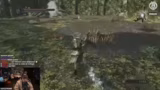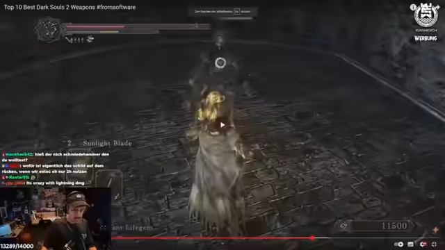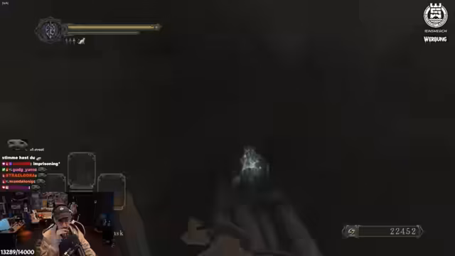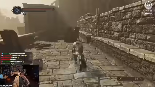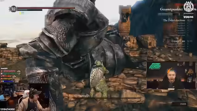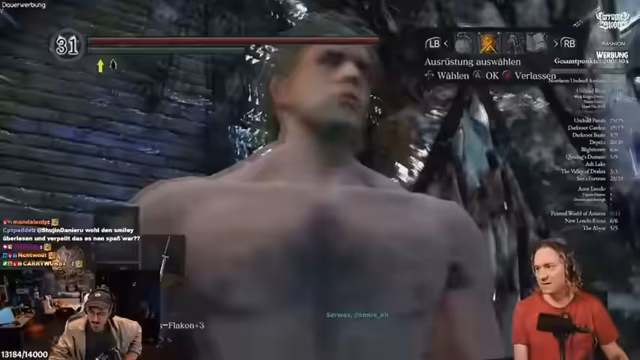 06:04:43Die Route führt zum Kampf gegen Benhat. Dieser Bosskampf dient dem Zweck, einen Branch zu erhalten, der es ermöglicht, die Pyromantin-Frau zu versteinern. Entgegen der Erwartungen ist der Kampf laut Streamer sehr einfach, da Benhart kaum Schaden anrichtet. Der zentrale Grund dafür ist die geringe Investition in die Vigor-Stat, die der Streamer auf 18 hält, und die leichte Rüstung. Die versteinerte Pyromantin wird für ihre hohen Feuerresistenzen im Spiel gepriesen.