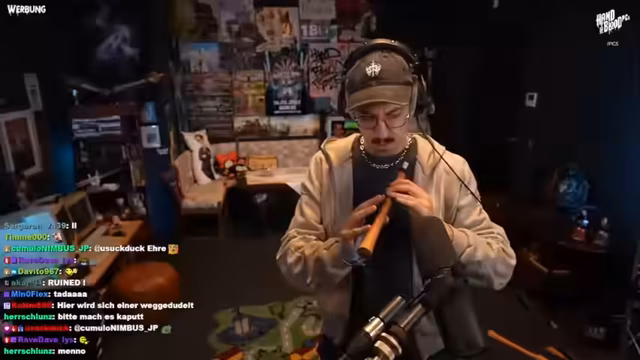 01:23:23Zu Beginn des Streams wird ein Dudelsack vorgestellt und dessen Aufbau erklärt, darunter die Wechselstock-Bauweise, die Dichtung mit Knochenleim und die Ausstattung der Blowpipe mit einem Plastikmundstück. Der Streamer probiert das Instrument aus und stellt fest, dass es viel Kraft erfordert, um den Druck im Sack aufrechtzuerhalten. Er experimentiert mit dem Blasen und dem Stöpseln, wobei er anfängliche Schwierigkeiten hat, den Sack am Laufen zu halten. Das Doppelrohrblatt in der Spielpfeife wird als besonders empfindlich erwähnt, weshalb vorsichtiges Handling empfohlen wird. Trotz anfänglicher Rückschläge sieht der Streamer einen ersten Fortschritt und möchte das Instrument weiter erlernen.